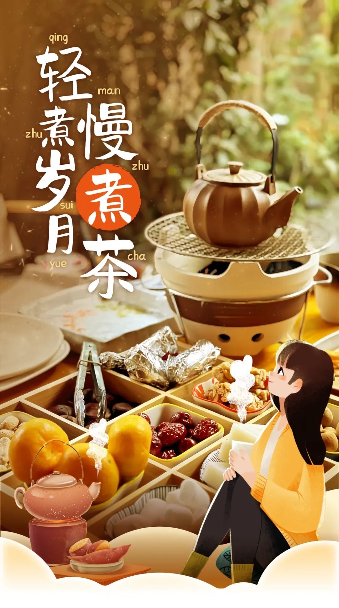 标配的炭火泥炉、冒着热气的茶壶、黄澄澄的柑橘……俨然一副写实版的“偷得浮生半日闲”。